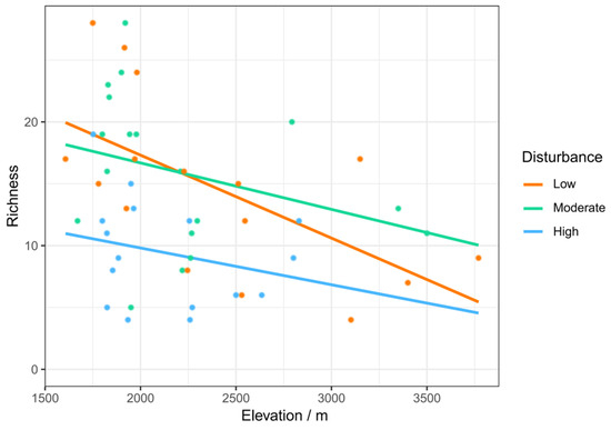 3.3. Hypothesis Testing for the Interaction of Elevation and Human Disturbance
