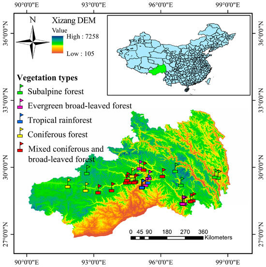 Distribution of sampling points of five vegetation types in the Xizang region.