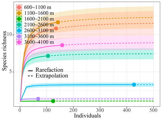 Figure 2 is the sparse curve of grasshopper communities at different altitudes. The real line-part of the sparse curve is the curve obtained by the interpolation of the measured values of the number of individuals and the number of species, and the imaginary line-part is the curve obtained by the predicted value of the extension of the measured values of the number of individuals and the number of species. Figure 2 depicts that with the increased number of investigated insects, the number of species at altitudes of 600–4100 m gradually stabilized, indicating that the sampling of grasshopper communities at seven altitude gradients was sufficient (Figure 2).