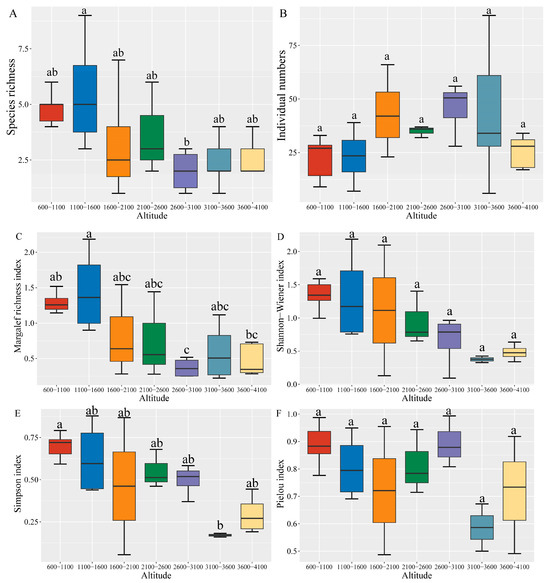 Diversity analysis of grasshopper communities at different altitudinal gradients in the Xizang Region: (A) species richness; (B) individual numbers; (C) Margalef richness index; (D) Shannon–Wiener index; (E) Simpson index; (F) Pielou index. Note: values are mean ± SD of three replicates for each typical vegetation community ecosystem. For each column, values with different letters are significantly different at p = 0.05.