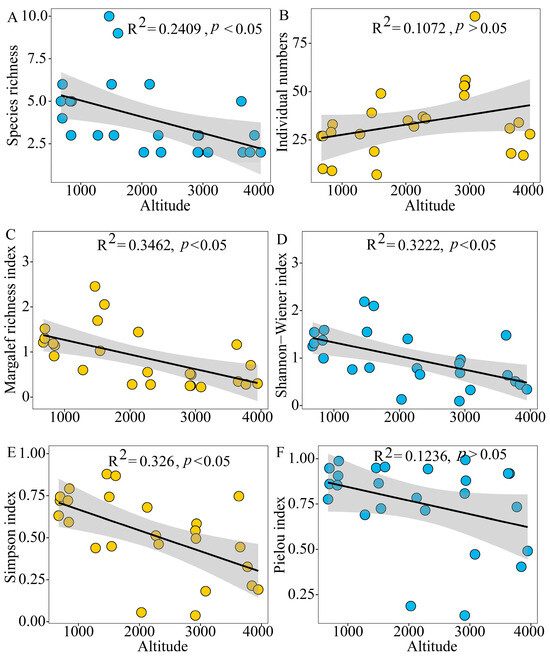 Elevation distribution pattern of grasshopper community diversity in the Xizang region: (A) distribution pattern of species richness; (B) distribution pattern of individual numbers; (C) distribution pattern of Margalef richness index; (D) distribution pattern of Shannon–Wiener index; (E) distribution pattern of Simpson index; (F) distribution pattern of Pielou index.