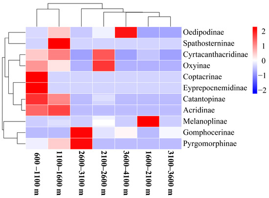 Heat map of the clustering of grasshopper family-level community structure at different altitudinal gradients in the Xizang region.