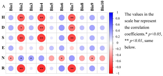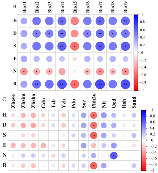 Heat map of the Pearson correlation between grasshopper community diversity and environmental factors at different altitudinal gradients in the Xizang region. Note: (A) Correlates with temperature factor; (B) Correlates with moisture factor; (C) Correlates with vegetation and soil factors. The color of the circle indicates the direction of the correlation, where blue indicates positive correlation and red indicates negative correlation, and the darker the color indicates stronger correlation.
