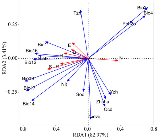 This study considered 17 environmental variables, including Bio1 (annual mean temperature), Bio2 (mean diurnal range), Bio4 (temperature seasonality), Bio6 (min. temperature of coldest month), Bio12 (annual precipitation), Bio14 (precipitation of driest month), Bio16 (precipitation of wettest quarter), Bio17 (precipitation of driest quarter), Bio19 (precipitation of coldest quarter), Zhengbei evenness (vegetation evenness index), Zhengbei Shannon (vegetation Shannon index), Tongzhixin (habitat homogeneity index), Yizhixin (habitat heterogeneity index), Soc (soil organic carbon), Phh2o (soil pH), nitrogen (soil total nitrogen), and Ocd (soil coarse debris volume fraction). The impact of these environmental factors on grasshopper community diversity was assessed. Results from redundancy analysis showed that the model’s total explanatory power was 86.38%, with the first and second axes explaining 82.97% and 3.41%, respectively. Significant differentiation in grasshopper community diversity at varying altitudes was observed on the RDA axis. The Shannon–Wiener index, Simpson dominance index, species richness, Pielou index, and Margalef richness index were negatively correlated with the RDA 1 axis, with projection scores of −0.2963, −0.2056, −0.4988, −0.1957, and −0.3448, respectively. The number of individuals exhibited a positive correlation with the RDA 1 axis, with a projection score of 0.3695. The Shannon–Wiener index, Simpson dominance index, and Pielou index showed positive correlations with the RDA 2 axis, with projection scores of 0.0396, 0.0658, and 0.1165, respectively. Conversely, the Margalef richness index, species richness, and number of individuals were negatively correlated with the RDA 2 axis, with projection scores of −0.0407, −0.0796, and −0.0154, respectively. Notably, precipitation in the coldest quarter, precipitation in the driest quarter, and annual average daily range were identified as the environmental variables with the highest absolute projection scores on the RDA 1 axis, scoring −0.7792, −0.7611, and 0.7343, respectively. The vegetation evenness index, annual average daily range, and habitat homogeneity index had the highest absolute projection scores on the RDA 2 axis, scoring −0.4506, 0.3776, and 0.3589, respectively (Figure 7).