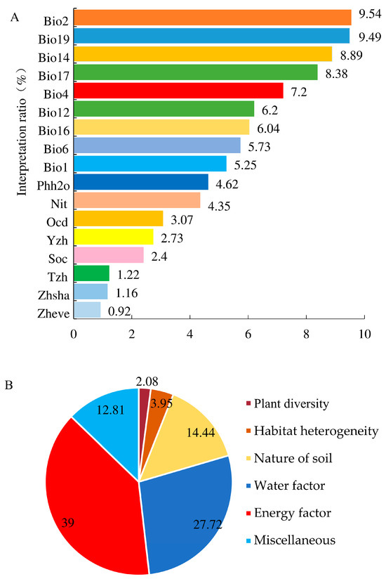 Hierarchical segmentation revealed that the total explanation rate of the selected environmental factors for the diversity of grasshopper communities in Xizang was 87.19%, with an unexplainable portion of 12.81%. The environmental factors with the highest explanation rates were the energy factor, water factor, and soil property, accounting for 39.00%, 27.72%, and 14.44%, respectively. Specifically, the three environmental factors with the highest interpretation rates were the annual average daily range, precipitation in the coldest quarter, and precipitation in the driest month, with rates of 9.54%, 9.49%, and 8.89%, respectively (Figure 8A,B).