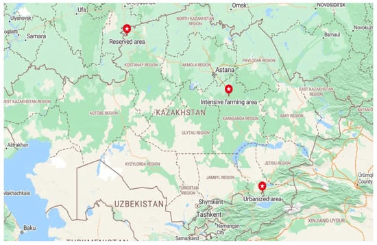 Honey samples were selected from three ecological areas in Kazakhstan. These regions differed in their geographical location, climatic conditions, environmental conditions, and landscape (Figure 1). Honey samples was collected from several hives from one apiary of a beekeeper in every area. Samples were taken after honey extraction during the honey harvest period in each region in July–August.