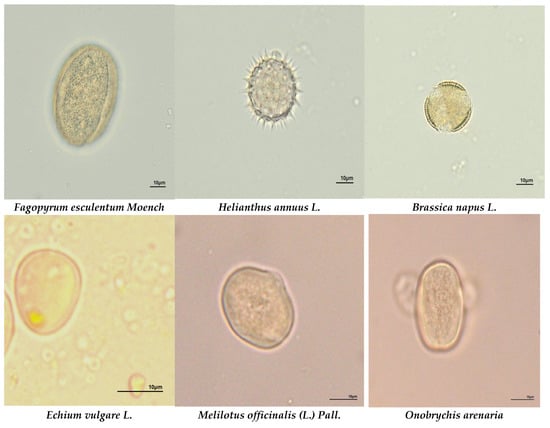 The preparation of honey for melissopalynological analysis was carried out as described previously, with some modifications [39]. Ten grams of honey was weighed and transferred into a 50 mL test tube. Twenty mL of distilled water (20–40 °C) was added to dissolve the honey, which was centrifuged at 4680 rpm for 15 min. The supernatant was removed. Twenty mL of distilled water was added to the sediment and it was centrifuged again for 5 min at 4680 rpm. The water was drained, and the test tube was turned at an angle of 45° and dried on filter paper.