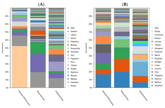 In the reserved area, the stationary apiary was surrounded by deciduous and coniferous forests. It has been observed that, in forested landscapes with high forest cover, bees are limited in pollen, and they more often forage for food in meadows and arable lands [21]. In this area, the beekeeper planted plants around the apiary, including those brought from other places to feed the bees. The research results show that the bees used the available plant species around the apiary. In the reserved area, the following plant genera prevailed: Melilotus (26%), Helianthus (22%), Brassica (17%), Solidago (12%), Erodium (7%), Lonicera (6%), Berteroa (6%), Filipendula (5%), and Onobrychis (5%). The biodiversity of the bee foraging plants was greatest in the reserved area. This may have been due to the fact that the beekeeper’s management allowed the bees to use additional available resources near the apiary.