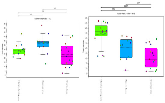 As can be seen from Figure 5, the alpha diversity was significantly lower in the urbanized area than in the others (p value = 0.00001). The rbcL marker showed greater species diversity within groups.