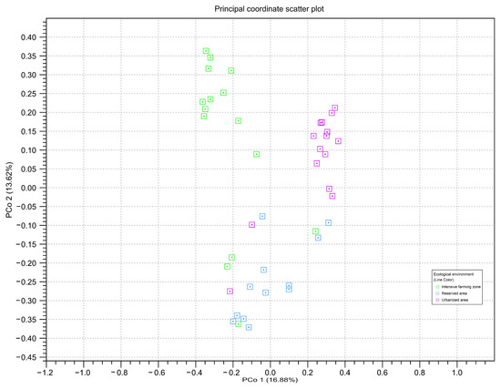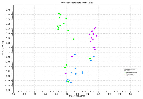 High alpha diversity was observed in the reserved and intensive farming areas. In the urbanized area, the diversity based on the total number of OTUs was lower, as confirmed by both markers (Figure 5).