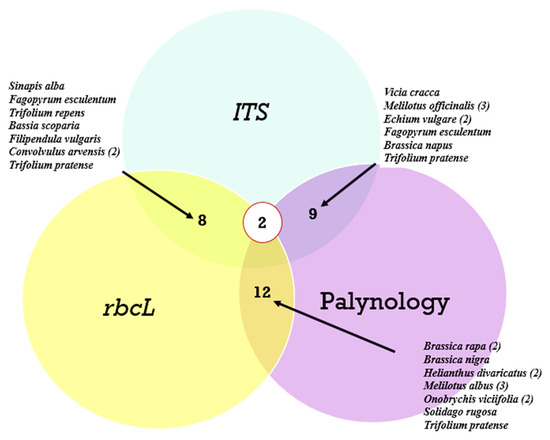In our study, the higher number of plant taxa in honey was obtained using the rbcL marker (326 taxa), while 233 taxa were identified using ITS2, and 219 taxa were identified using melissopalynological analysis. When comparing the three analyses considering the most represented plants, most matches were between the rbcL marker and the melissopalynological analysis. The ITS2 marker revealed almost the same number of matches with rbcL and melissopalynology, but this marker missed or underestimated some relevant genera (e.g., Sinapis). Only two species, Trifolium pretense and Brassica nigra, were identified by all three analyses. Species such as Convolvulus arvensis, Melilotus officinalis, Echium vulgare, Brassica rapa, Helianthus divaricatus, and Onobrychis viciifolia were not only identified by different methods but also occurred in different ecological areas.