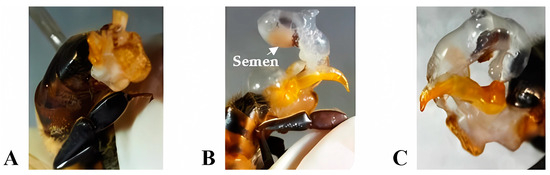 Eversion of the copulatory apparatus: To obtain the percentage of partial and total eversions, the technique described by Collins and Donoghue [31] was applied. It consists of the manual eversion of the endophallus by holding the drone by the head and thorax, ventrodorsally oriented, with the abdomen upwards, between the thumb and index finger, and applying pressure on the abdomen. The result of the technique was classified into A = Without eversion, B = Eversion with ejaculation, and C = Eversion with the absence of semen (Figure 1).
