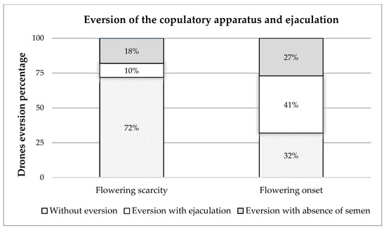 The results obtained from the eversion of the copulatory apparatus and ejaculation of drones (Figure 1) showed that, during the period of flowering scarcity, of the 400 drones collected, 72% (288 drones) did not evert the endophallus, while 10% (39 drones) showed eversion with ejaculation, and the remaining 18% (73 drones) showed eversion with the absence of semen. At the onset of the flowering period, it was observed that, of the 400 drones collected, 32% (130 drones) did not evert the endophallus, while 41% (162 drones) showed eversion with ejaculation, and 27% (108 drones) showed eversion with the absence of semen (Figure 2).