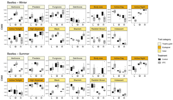 Boxplots highlighting the effect of the treatment (control vs. OTCs) on different traits along the elevation gradient considering only beetles during the winter and the summer. On y-axis are the value of the community weighted means (CWM) and on x-axis is the elevation factor: low (L), middle (M), and high (H) elevation. Black box plots indicate the control plots, while gray box plots represent the OTCs. ANOVA and post hoc pairwise comparisons results are available in Table A3 and Table A4.