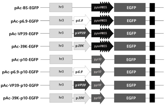 Schematic representation of the virus-induced transient expression vectors expressing EGFP. The very late p10 or polh promoter with four repeated BSs was used as the main promoter to express EGFP. Additional promoters, such as p6.9, vp39, or 39K promoters, were inserted between the main promoter and the transcription factor hr3.