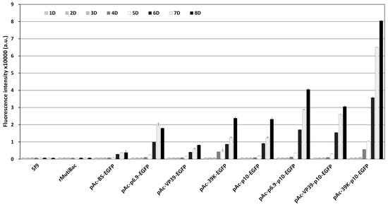 Fluorescence intensity of Sf9 cells by virus-induced transient expression. Each virus-induced transient expression vector was introduced into Sf9 cells and then inoculated with rMultiBac at an MOI of 0.01. The fluorescence intensity of the cell extracts was measured using fluorescence photometry up to 8 days p.i. and is shown in arbitrary units (a.u.). The data are expressed as the means ± standard error (SE). All experiments were replicated three times.