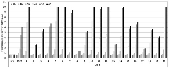 A DNA fragment capable of expressing EGFP under the final expression structure was transformed into the Sf9 cell genome using the piggyBac vector. After antibiotic treatment, cell colonies formed from a single cell were separated and cultured in a 96-well plate. After that, only surviving cells were passaged up to 10 times using 24-well and 6-well plates. Finally, 20 transgenic cell lines were selected from 92 initial cell colonies. Transgenic cell colonies were selected through antibiotic treatment and subcultured more than 10 times to ultimately select 20 transgenic cell lines. The selected transgenic cell lines were named Sf9-T, and PCR assay confirmed the presence of the EGFP gene in the cell genome. The fluorescence expression levels in response to virus infection were compared for the 20 selected Sf9-T cell lines. According to the results, clear fluorescence expression was observed from 3 days p.i. in all the Sf9-T cell lines, including Sf9-ET, which was used as a control (Figure 3). Of note, fluorescence expression was observed in the Sf9-T-20 cells at 1 day p.i. and had already reached its maximum at 4 days p.i, at which point the fluorescence intensity was approximately five times that in the Sf9-ET cells. Therefore, the Sf9-T-20 cell line, which showed the most rapid and intense fluorescence, was selected as the final transgenic cell line and named Sf9-QE (with “QE” standing for quick and easy).