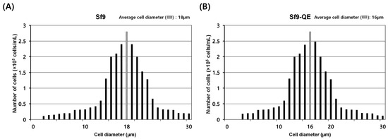 Diameters of Sf9 (A) and Sf9-QE (B) cells. Cell size was measured using FACSCOPE®® B (CURIOSIS, Seoul, Republic of Korea). The hatched box indicates the median value.
