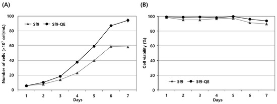 The external appearance of the Sf9-QE cells was no different from that of the Sf9 cells exhibiting epithelial morphology. However, their cell diameter, at approximately 16 μm on average, was approximately 2 μm smaller than that of the Sf9 cells, at approximately 18 μm in diameter (Figure 4 and Figure S4). When comparing cell proliferation, the Sf9-QE cells showed higher proliferation than the Sf9 cells from day 2 and had a proliferation rate around 1.6 times higher on day 7, when the highest rate of proliferation was exhibited (Figure 5A). However, no significant difference was found in the cell survival rate, which was found to be slightly higher for the Sf9-QE cells at an average of about 3% (Figure 5B). Additionally, no differences were observed between the two cell lines during the subculture process, including cell attachment or detachment to the culture plate. The results of our study suggest that the decreased size of the Sf9-QE cells may be related to their increased proliferation rate. However, the reasons for the decrease in cell size may be elucidated through further studies of the number and location of target genes introduced into the cell genome.