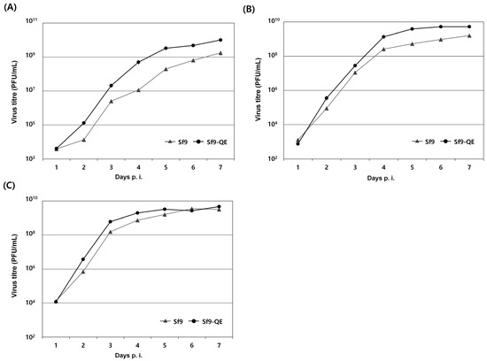 Virus growth curves in Sf9 and Sf9-QE cells. The cells were infected with rMultiBac (A), rAc-PPV-VP2 (B), and rAc-LacZ (C) at an MOI of 0.1. Supernatants were collected at the indicated day points, and the virus titers were determined by the end-point dilution assay method in Sf9 and Sf9-QE cells. The virus titer was calculated in PFU (plaque-forming units) from the TCID50 value. All experiments were replicated three times.
