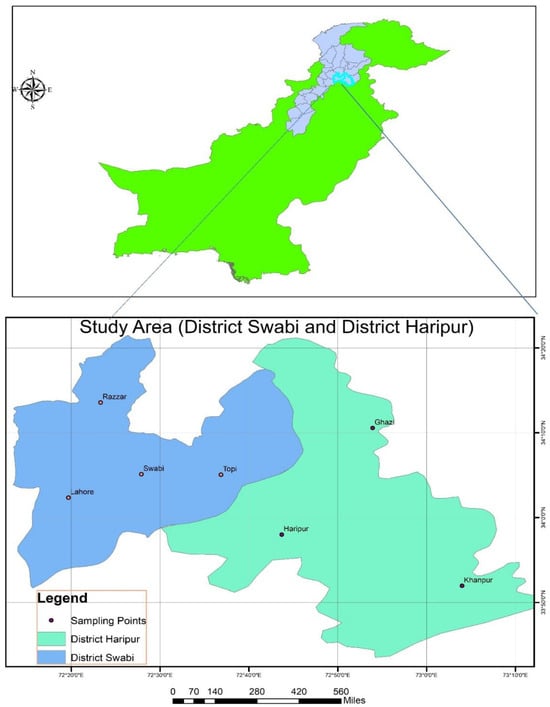 Callosobruchus maculatus specimens were collected along with infested mung bean grain from various stored grain godowns in Swabi—a tehsil located in the Swabi District (34.1331° N, 72.4495° E), Razar (34.2554° N, 72.4021° E), Topi (34.1676° N, 72.6861° E), Lahore (34.1270° N, 72.4741° E), Haripur, which is a tehsil located in the Haripur District (33.9946° N, 72.9106° E), Ghazi (34°01′05″ N, 72°39′04″ E), and Khanpur (33.8020° N, 72.9077° E), in Khyber Pakhtunkhwa, Pakistan, and transported to the Entomological Laboratory of the University of Haripur (33.9781° N, 72.9128° E) for identification. The collected C. maculatus species were identified by the method followed in Ref. [18]. The inner surface of the hind femur is smooth, with the inner tooth usually as long as, or slightly longer than, the outer tooth. In fully developed individuals, the pronotum displays a black cuticle and is covered with golden setae, except on the basal median elevations, which extend well past the posterior edge and are covered in white, scale-like setae. The eyes are deeply notched, prominent, and bulbous. The male genitalia are distinctive, featuring a median lobe with two longitudinally sclerotized, denticulate regions near the middle, and robust, broadly spatulate parameres. Also, the coloration on the plate covers the end of the abdomen. Generally, females are larger than males.