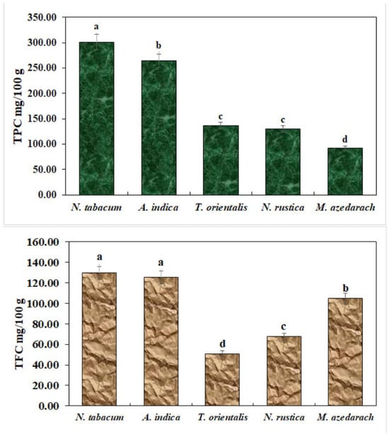Total phenol and flavonoid contents were estimated as shown in Figure 2. N. tabacum exhibited the highest number of total phenol and flavonoid contents.