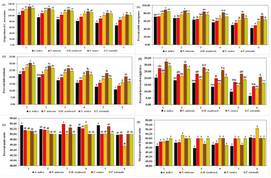 Like males, no significant difference was observed in the percentage of female emergence of C. maculatus with five plant extracts and six different concentrations. In general, it ranged from 49.57 to 50.45 (Figure 3f). This means that the female emergence rate in C. maculatus remained unaffected by any successive increase in the concentration of plant extracts. From Table 3, one can see that the overall mean percentage of female C. maculatus was 50.08% with M. azedarach and 49.74% with A. indica.