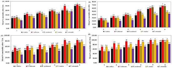 Mean percent mortality of C. maculatus after (a) 24 h, (b) 48 h, (c) 72 h, (d) 94 h of exposure to the ethanolic extracts of five plant species at six different concentrations. The bars with different lowercase letters indicate that the means are significantly different from each other at p = 0.05.