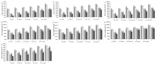 Mean percentage repellency rates of C. maculatus after (a) 1 h, (b) 6 h, (c) 12 h, (d) 24 h, (e) 48 h, (f) 72 h, and (g) 96 h of exposure to the ethanolic extracts of five plant species at six different concentrations. The bars with different lowercase letters indicate that the means are significantly different from each other at p = 0.05.