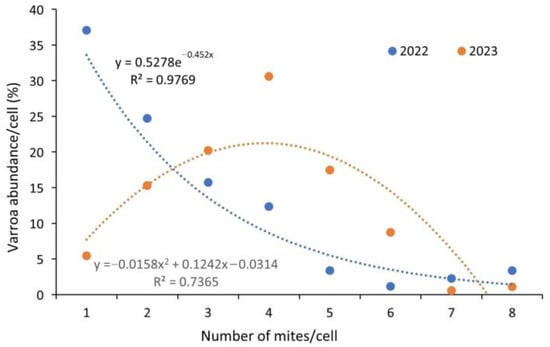 In 2022, mite abundance followed an exponential trend line. In contrast, the evolution of mite abundance in the 2023 sampling was best described by a second-degree polynomial equation. The most significant difference observed was a nearly 30% higher prevalence of brood cells containing a single mite in 2022 compared to 2023.