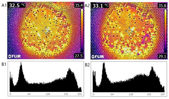 Thermal images of the same hive and frame captured at different time points ((A1) 23.10.14; (A2) 23.10.15), along with pixel intensity histograms (B1,B2) generated from digital image processing.