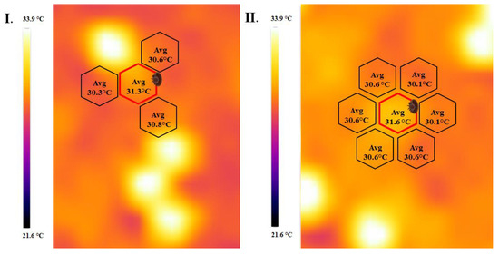 The results of infrared (IR) thermal imaging of sealed brood cells of worker bees showed that higher temperatures could be detected on the surface on the wax capping of the developing pupae infested by Varroa mites. The differences can be seen in the thermal images in Figure 4. One of the main findings of the research is that two different heating patterns were recognized on the thermal images, both of which were responsible for the elevated temperature of the parasitized cells. The most common heating pattern is the heating cell, as shown on the left pane in Figure 4(I.). The parasitized cell next to a heating cell, indicated by the hexagon marked with the mite, shows a higher temperature compared to the neighboring cells. A hotspot-elevated temperature pattern can be observed in the right pane in Figure 4(II.). The mite-infested brood cell in the center shows a similar tendency: on average, this cell is 0.65 °C warmer than the neighboring cells. The same tendency was measured during the two years when we compared intact individuals at the same stage of development that were neighboring parasitized individuals. The average temperature of infested individuals was 30.78 ± 0.09 °C, approximately 0.82 °C higher than that of intact worker cells (29.96 ± 0.08 °C) in 2022. The 2023 studies similarly confirmed the fact that parasitized cells had a higher temperature (30.62 ± 0.14 °C) than adjacent, intact individuals (29.86 ± 0.08 °C), averaging 0.76 °C higher. One-way analysis of variance confirmed in both experimental years that brood cells with parasite development alongside individuals of different preimaginal stages had statistically verifiably higher temperatures than those without mites (df = 1; F = 118.76; p < 0.001).