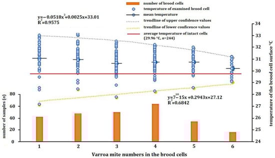 The temperature values measured on the cap surface, with different numbers of mites in the cell, are shown in Figure 5. Brood cells with a high number of mites/cell (7 (n = 3), 8 (n = 5) and 13 (n = 1)) were excluded from the statistical analyses because of the low number of elements. The single-factor analysis of variance confirmed that there was a statistically valid correlation between the number of mites in a brood cell and the average value of the surface temperatures of the parasitized cells (df = 1; F = 57,919.99; p = 0.001). As the number of mites increases, the confidence interval of the surface temperatures becomes narrower, described by a polynomial decrease in the trend lines drawn at the upper and lower limits of confidence. This verifiable correlation is shown by the result of the statistical analysis of the confidence intervals between the minimum and maximum temperature values measured on brood cells loaded with different numbers of mites. However, it can be observed that the evolution of the mean temperature values with an increasing number of mites per brood cell is stable within a range of 30.0–30.5 °C, representing the mean value. The mean value of the intact cells was 29.98 °C. At a low level of parasitation (one mite/cell: 32.9–27.1 °C; two mites/cell: 33.0–28.4 °C), the mean surface temperatures are within a wide range, whereas at a Varroa load of three mites and above (three mites/cell: 32.4–27.7 °C; four mites/cell: 32.1–29.1 °C; five mites/cell: 31.9–28.5 °C; six mites/cell: 31.1–29 °C), the surface temperatures are continuously narrowing.