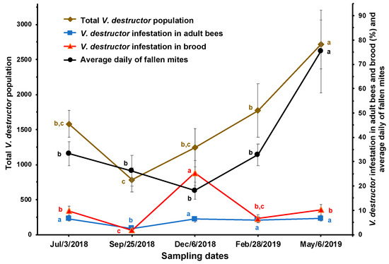 Jack and Ellis [49] developed a formula to estimate the overall population of V. destructor in a honey bee colony based on the number of mites naturally fallen onto an adhesive board installed in a hive. We found that our total estimate of mites/hive was on average lower than the number of mites predicted by the formula. This is probably due to the fact that in our study we did not consider the population of V. destructor in drone brood.