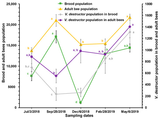 Estimated population of brood, adult bees, and V. destructor in brood and adult bees (±SE) at different times of the year in honey bee colonies (n = 10) established in a temperate semi-arid climate. Different letters between means for each variable indicate significant differences based on analyses of variance and Tukey tests.