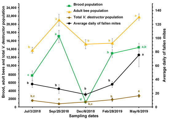 Estimated brood, adult bees, and total V. destructor populations and average daily mite drop (±SE) at different times of the year in honey bee colonies (n = 10) established in a temperate semi-arid climate. Different letters between means for each variable indicate significant differences based on analyses of variance and Tukey tests.