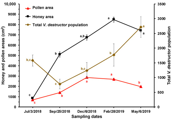 Honey and pollen areas (cm2) and estimated total population of V. destructor mites (±S.E.) at different times of the year in honey bee colonies (n = 10) established in a temperate semi-arid climate. Different letters between means for each variable indicate significant differences based on analyses of variance and Tukey tests.