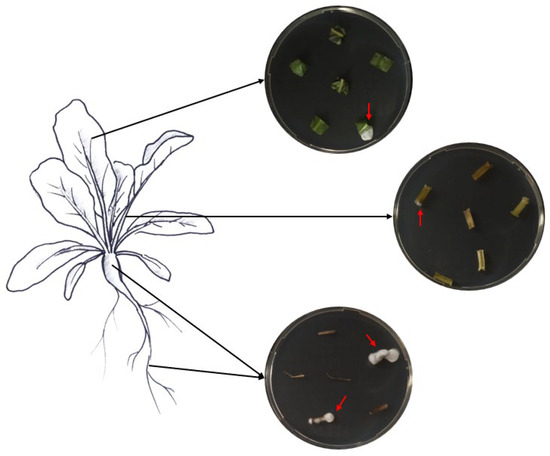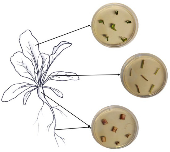 Samples of roots, hypocotyls, leaves, and petioles were collected from ten randomly chosen treated plants to assess the endophytic colonization of both fungi. From each plant part, six pieces of respective tissues with different sizes were cut with sterile scissors (roots, 1.5 cm; hypocotyls, 2 cm; petioles, 2 cm; leaves, 3 × 3 cm). The various collected plant pieces were subsequently surface-sterilized by immersion for 2 min in 70% and 2% NaClO, followed by three rinses in ddH2O sterile water, following Parsa et al. [32]. Sterilization efficacy was assessed as described above. The edges of the surface-sterilized plant tissues were trimmed using sterile scalpels and cut into small pieces (roots, 1 cm; hypocotyls, 0.5 cm; petioles, 0.5 cm; leaves, 0.5 cm). Then, the different plant pieces were partially inserted into SDA media supplemented with the antibiotics mentioned above (Figure 1). The different Petri dishes were incubated at 25 °C in darkness for a period of 14 days. The monitoring of outgrowth mycelia from plant tissues was conducted daily.