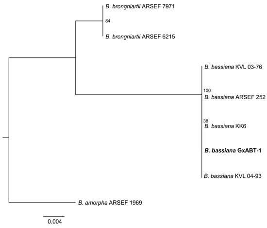 To pursue fungal identification at the species level, mycelia and conidia cultured on SDA media for 14 days were harvested by scraping off a portion of the fungal culture using a sterile cell spreader. The harvested fungal structures (mycelia and conidia) were then transferred to Eppendorf tubes with sterile steel beads and ground into a fine powder using Retsch-MM 400 (Verder scientific, Haan, Germany). A second grinding was performed after freezing the samples in liquid nitrogen for 30 s. Genomic DNA extraction was performed using a DNeasy Plant Mini kit (Qiagen, Hilden, Germany) following the manufacturer’s instructions. PCR amplification of the ITS1–5.8S–ITS2 region of the rRNA gene cluster [25] was performed using the primer pairs ITS5 (5′-GGAAGTAAAAGTCGTAACAAGG-3′)/ITS4 (5′-TCCTCCGCTTATTGATATGC-3′) [26]. PCR amplification was performed in reaction volumes of 50 µL containing 25 µL of Q5 High-Fidelity 2X Master Mix (New England Biolabs, Hitchin, UK), 2.5 µL of each primer (10 µM), and 5 µL genomic DNA (10 ng/µL). Cycling conditions were denaturation at 98 °C for 3 min, followed by 35 cycles of denaturation at 98 °C for 1 min, annealing at 55 °C for 1 min, and extension at 72 °C for 1 min 30 s, with a final extension at 72 °C for 10 min. PCR amplifications were run on 1% agarose gels (1× TAE buffer) at 110 V for 30 min by electrophoresis, and the products visualized with SYBR Safe (Invitrogen, Carlsbad, CA, USA) in a Biorad Universal Hood II Gel Doc Imaging System. Prior to sequencing, the PCR products were purified with NucleoSpin Gel and a PCR Clean-up Kit (Macherey-Nagel, Düren, Germany) according to the manufacturer’s instructions. Sanger sequencing was performed by Eurofins Genomics (Ebersberg, Germany), and a Basic Local Alignment Search Tool (BLAST) on the National Center for Biotechnology Information (NCBI) database was performed. Afterwards, the gene sequence was aligned with reference sequences obtained from Genbank (Table S1) using MEGA X [27]. The phylogenetic tree of ITS sequences was constructed with the IQ-TREE program [28]. Beauveria amorpha was used as the outgroup. Kimura’s two-parameter model (estimated via Akaike Information Criterion using jModelTest v.2.0 [29]) was applied, and maximum likelihood analysis was run with 10,000 ultrafast bootstrap replicates.