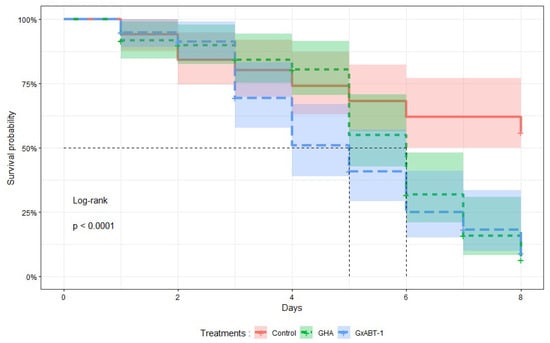 Kaplan–Meier survival curves showing the proportion of surviving treated aphids over time after exposure to two isolates of Beauveria bassiana, GHA and GxABT-1. The mean survival time is indicated by the vertical dashed lines for each isolate.