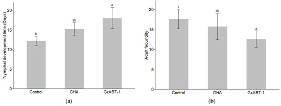 Impact of fungal endophytic colonization of sugar beet plants by Beauveria bassiana GHA or GxABT-1 isolates on aphid (a) nymphal development time and (b) adult fecundity (number of produced first instar nymphs). The significance letters (a, b) indicate statistically different treatments determined by a post-hoc Tukey test.