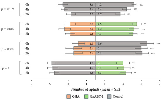 Plant selection by aphids between control and fungal inoculated plants (Beauveria bassiana GHA or GxABT-1) during dual-choice tests. Each test involved the release of 10 aphids and observation after 2, 4, and 6 h. The numbers included in the horizontal bars represent the mean number of aphids visting each of the treatements. To the left, the p-values represent tests comparing aphid distribution over time. ns, not significant. Asterisks indicate significance levels: ** p < 0.01, *** p < 0.001.