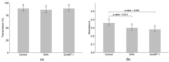Neither of the two B. bassiana isolates showed an effect on the transmission of BMYV in terms of infected plants (Figure 8a) (GLMM: χ2 = 0.17, df = 2, p = 0.918). However, a slight decrease but not significant in the registered absorbance—which reflect the viral load in the tested samples—was observed for the treated plants over those of the controls (LMM: χ2 = 5.61, df = 2, p = 0.060). Delving deeper with a post-hoc test reveals that this difference lies between the control and the endemic isolate GxABT-1, where a slight decrease in viral load was observed (Tukey: p = 0.0595).