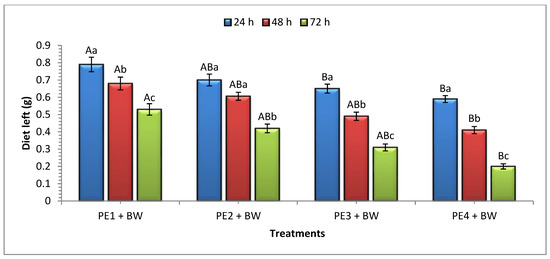 Mean (±SE) weight loss (mg) in Galleria mellonella larvae after 24, 48, and 72 h after exposure fed on PE alone and different combinations of co-diets. For each treatment, within each row, means followed by the same uppercase letter are not significantly different (Tukey–Kramer (HSD) test at p = 0.05). For each treatment, within each column, means followed by the same lowercase letter are not significantly different (Tukey–Kramer (HSD) test at p = 0.05).