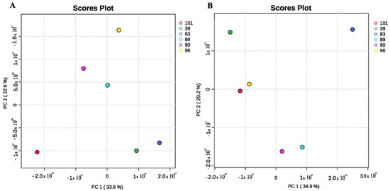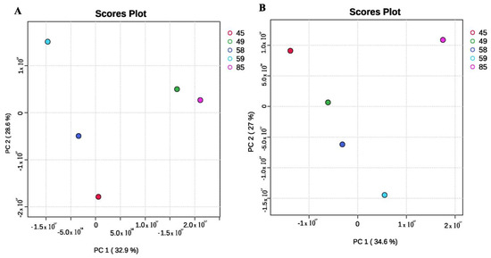Score plots of different strains of S. nojiriensis based on the compounds available in their ethyl acetate (A) and hexane (B) crude extracts, demonstrating the intraspecies variation in metabolite profiles.