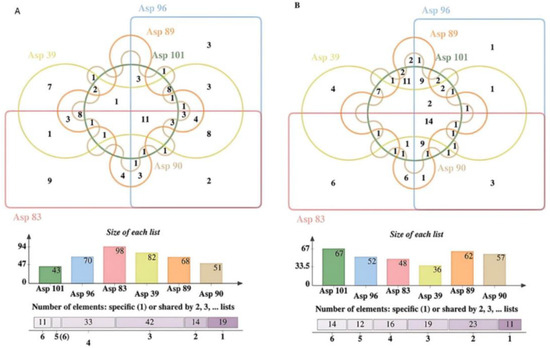 Venn diagrams representing the overlap and numbers of compounds in ethyl acetate (A) or hexane extraction (B) crude extracts of different isolates (Asp 101, Asp96, Asp 83, Asp39, Asp89 and Asp90) of S. nojiriensis based on LC-MS/MS identification. Please refer to Supplementary Table S1 for the full list of compounds identified.