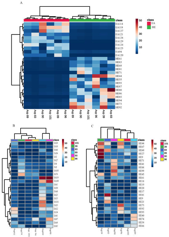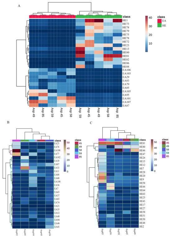 Several compounds from EA and HE of S. nojiriensis and S. novaecaesareae were identified as useful biological markers to differentiate isolates from these species due to very high PLS-DA variable importance projection (VIP) scores obtained (Figure 7). Ethyl,5-(4-chloro-2-methoxy-5-methylanilino)quinazoline-2-carboxylate (EA73) appeared to contribute to the separation with the highest score on isolates of S. nojiriensis extracted with ethyl acetate. The level of this compound was significant higher in Asp39 (9.6 × 1014) and not even produced in Asp89 and Asp96 (Figure 7A). A similar trend was observed in isolates of S. nojiriensis extracted with hexane, where 2-[[3-(2-bromophenyl)-1,2,4-oxadiazol-5-yl]methyl]-6-(4-butoxyphenyl)pyridazin-3-one (HE22) had the highest level in Asp96 (7.5 × 1014) and were not even produced in Asp39, Asp83 (Figure 7B).
