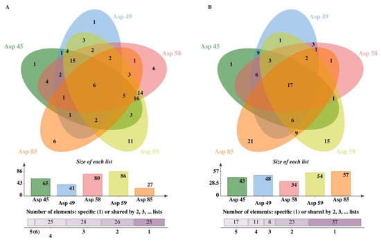 Venn diagrams representing the overlap and number of compounds in ethyl acetate (A) or hexane (B) crude extracts of different isolates (Asp45, Asp49, Asp58, Asp59 and Asp85) of S. novaecaesareae based on HPLC-MS/MS identification. Please refer to Supplementary Table S1 for the full list of compounds identified.