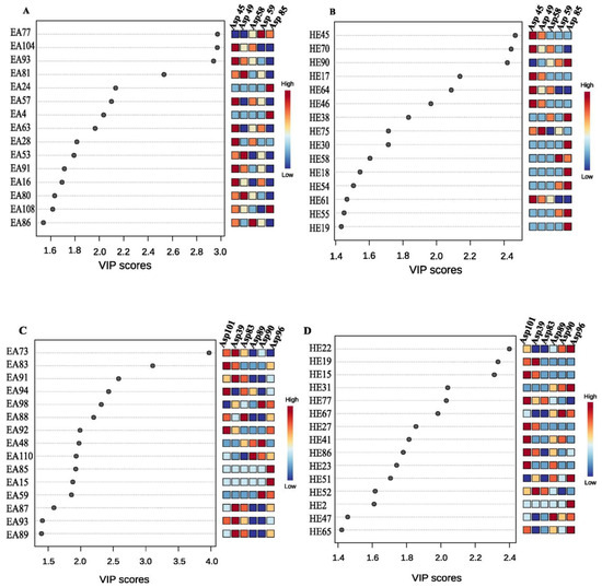 PLS-DA variable importance projection (VIP) scores of metabolites in (A,B) ethyl acetate (EA) and (B,D) hexane (HE) extracts of different strains of S. nojiriensis (A,B) and S. novaecaesareae. (C,D). Higher the VIP score of a metabolite, better it is as a biological marker to contribute with the differentiation of treatments. The abundance of metabolites in each sample is shown as a color scale from red (highest abundance) to blue (lowest abundance). Check Supplementary Table S1 for the full identification of compounds represented in this figure.