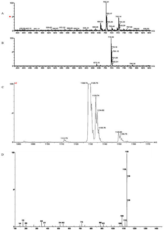 ESI+ (A) and ESI− (B) spectra of the active fraction AE58M of the ethyl acetate crude extract from the isolate Asp58 of S. novaecaesareae; (C) MS-ESI+ spectrum of the active fraction HE59B-D from the isolate Asp59 of S. nojiriensis and (D) CID spectrum of ion 1128 m/z.